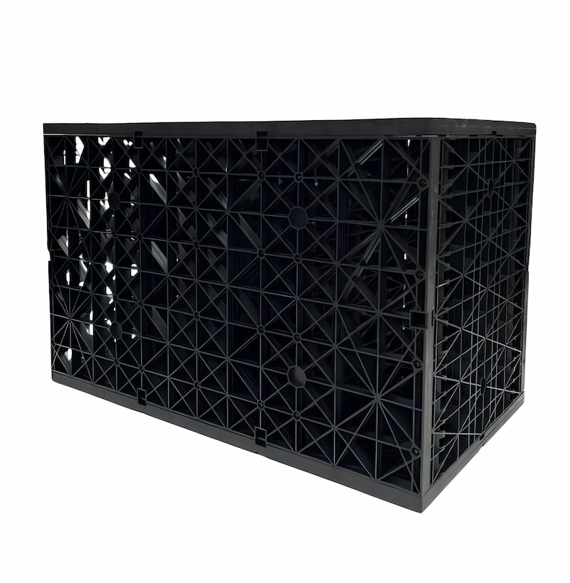 La configuración depende en gran medida del área de huella propuesta. Por ello, el Ecotank puede ajustarse según dicha área, permitiendo modificar sus dimensiones y componentes para alcanzar la capacidad requerida. Su peso ligero y diseño apilable facilitan el transporte y reducen tiempos y costos de obra, además, favorece la infiltración natural, reduce escurrimientos y promueve el aprovechamiento del agua pluvial.